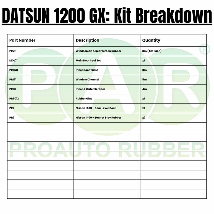 Full Rubber Kit For Datsun 1200 Gx 4 Door